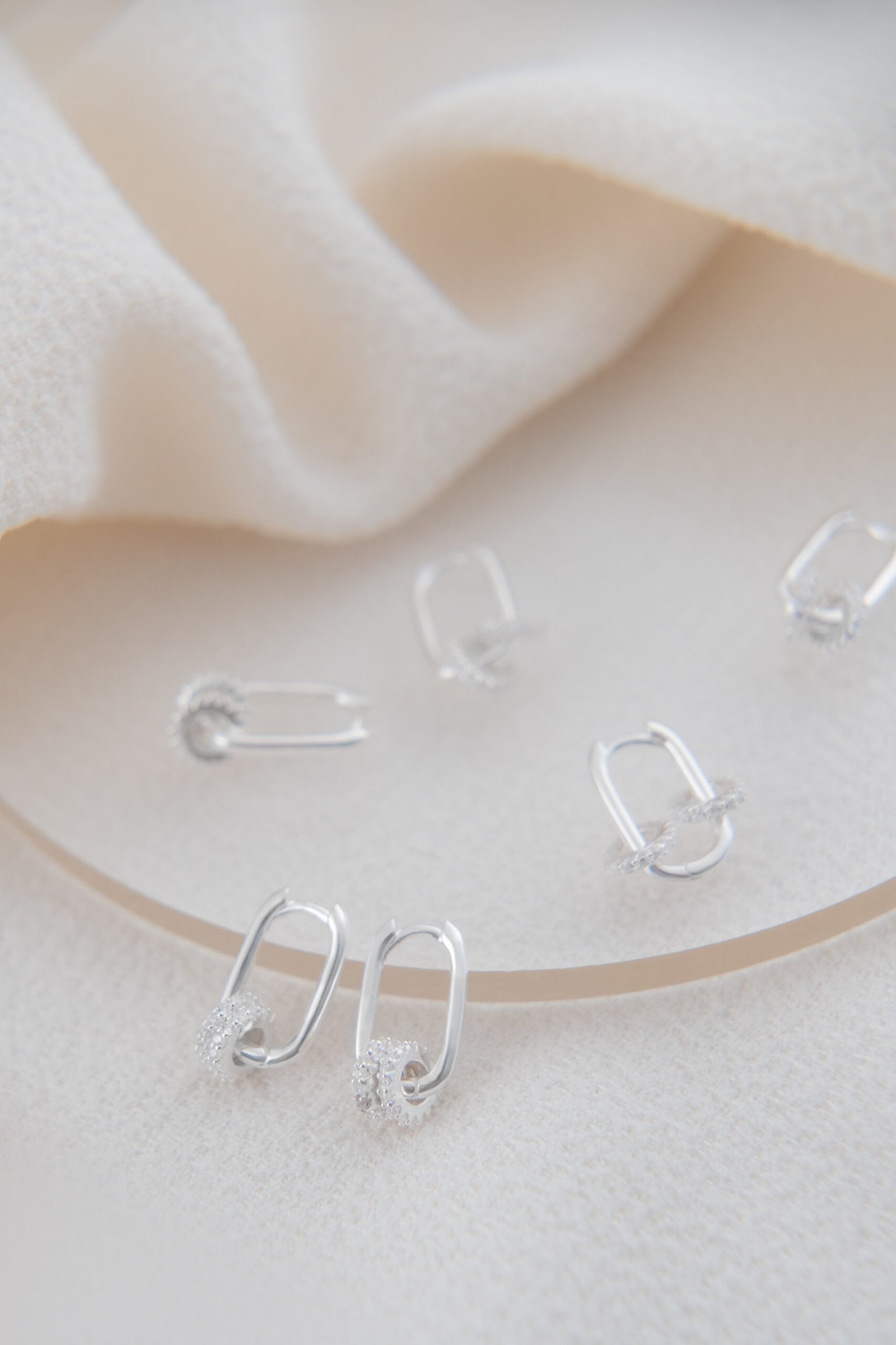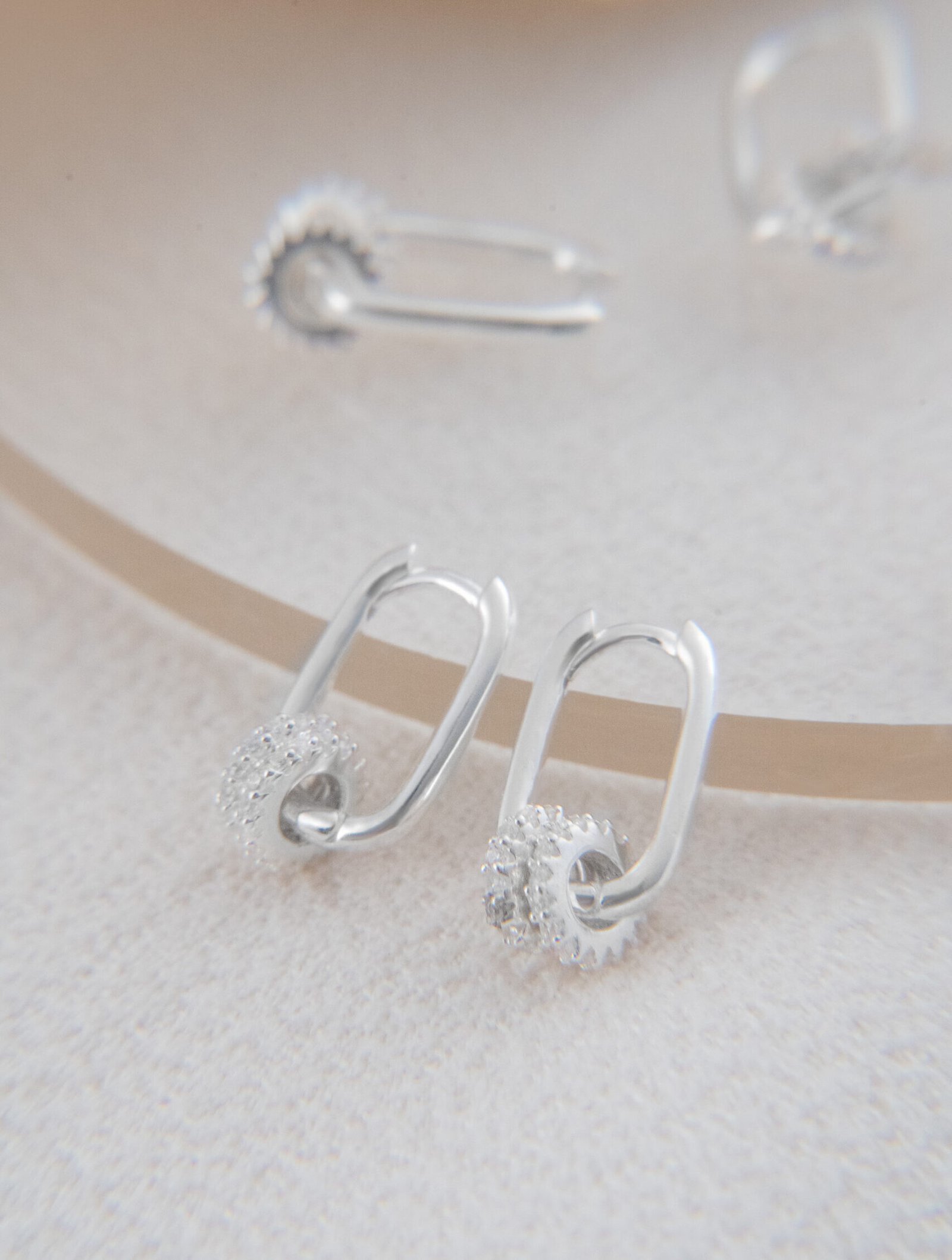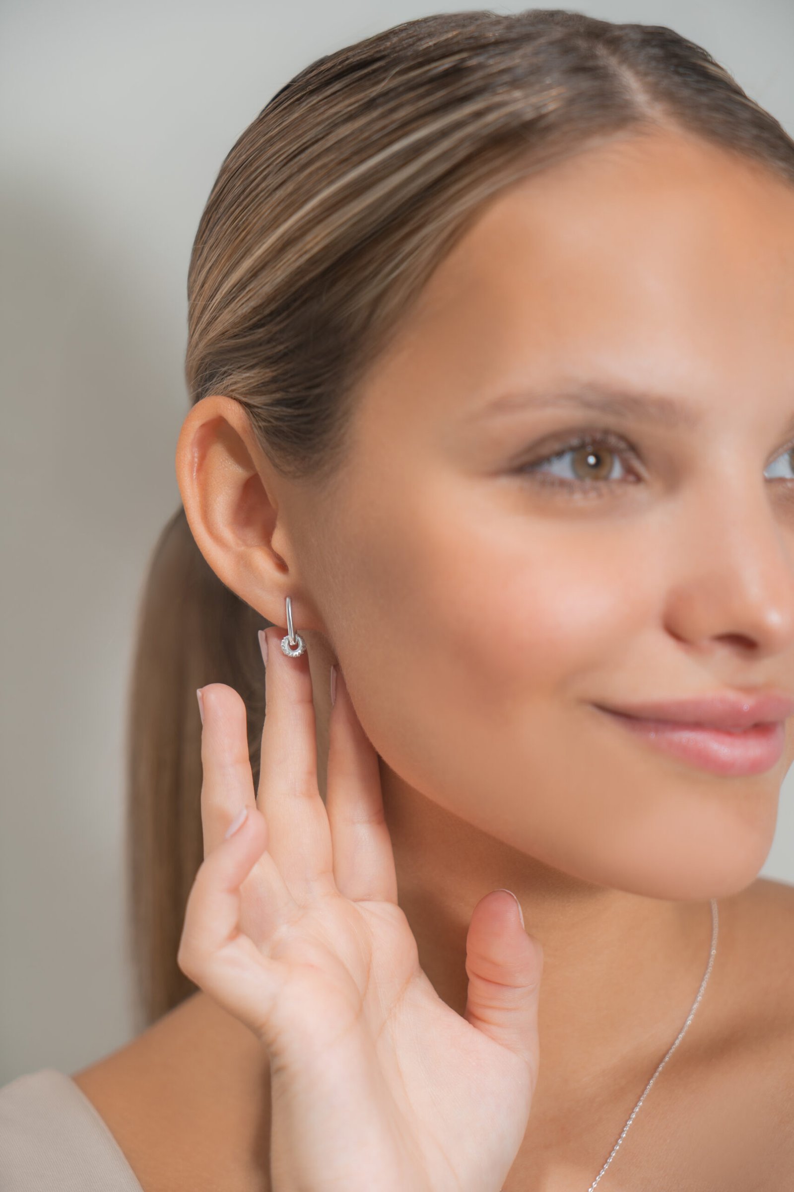 Argollas de Plata 925 con cubic zirconia. Su diseño rectangular liso se combina con dos dijes colgantes en forma de dona, cada uno repleto de cubic zirconia engarzados, logrando un equilibrio perfecto entre volumen, brillo y movimiento.