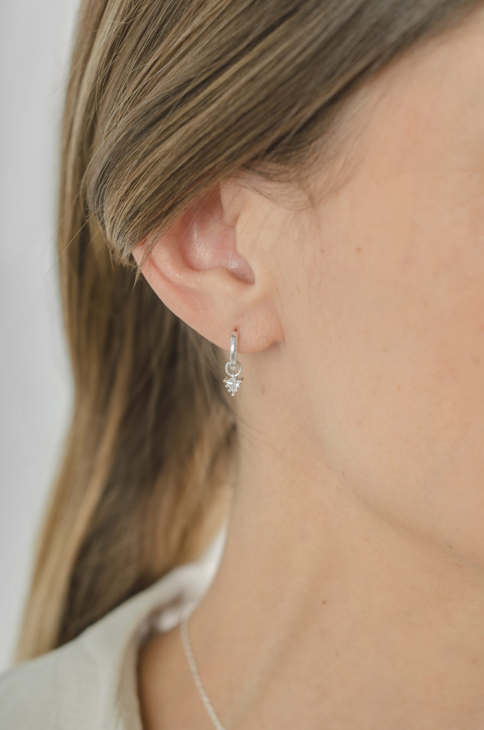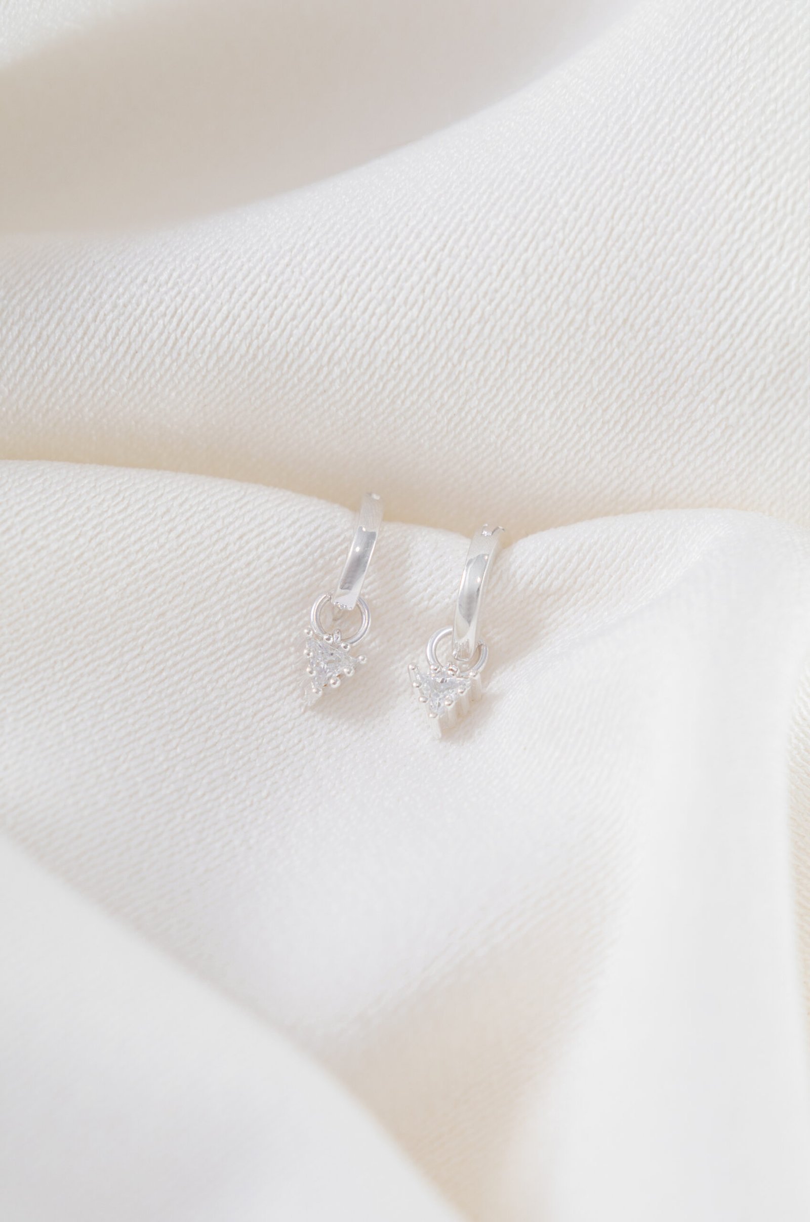Argollas de Plata 925 con cubic zirconia. Este diseño combina la simpleza de una argolla lisa con un dije colgante que reúne tres cubic zirconias engarzados, aportando un brillo sutil y delicado. La terminación es segura y cómoda, ideal para acompañarte todos los días.
