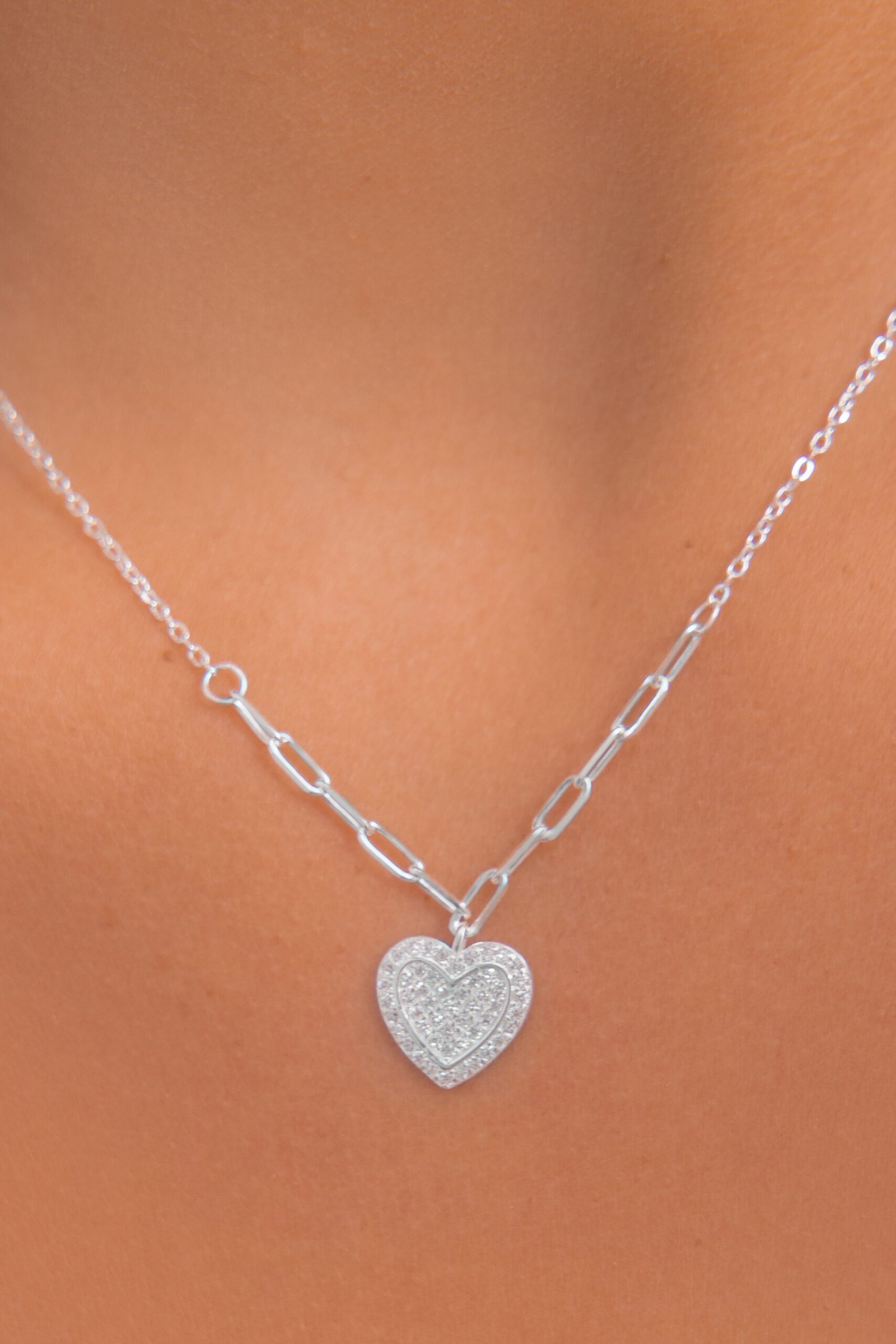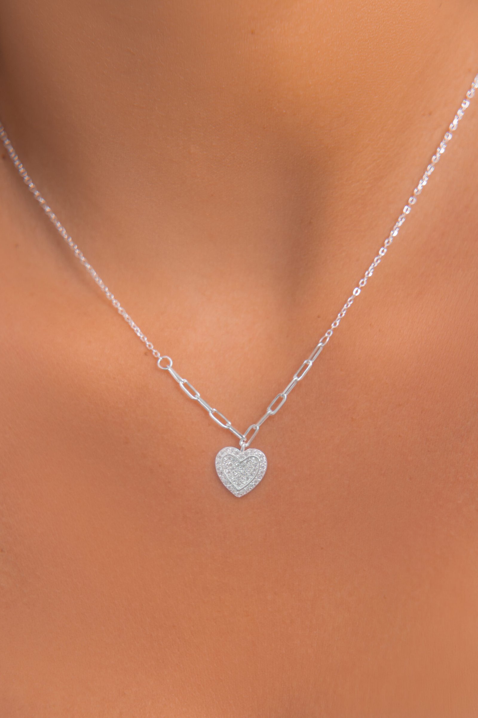 Collar de Plata 925 con dije en forma de corazón con microcubics zirconias. La cadena de tramados combinados, con secciones de forcet redondeado y forcet largo en el centro, le brinda un equilibrio entre textura y movimiento, creando un estilo único y sofisticado.