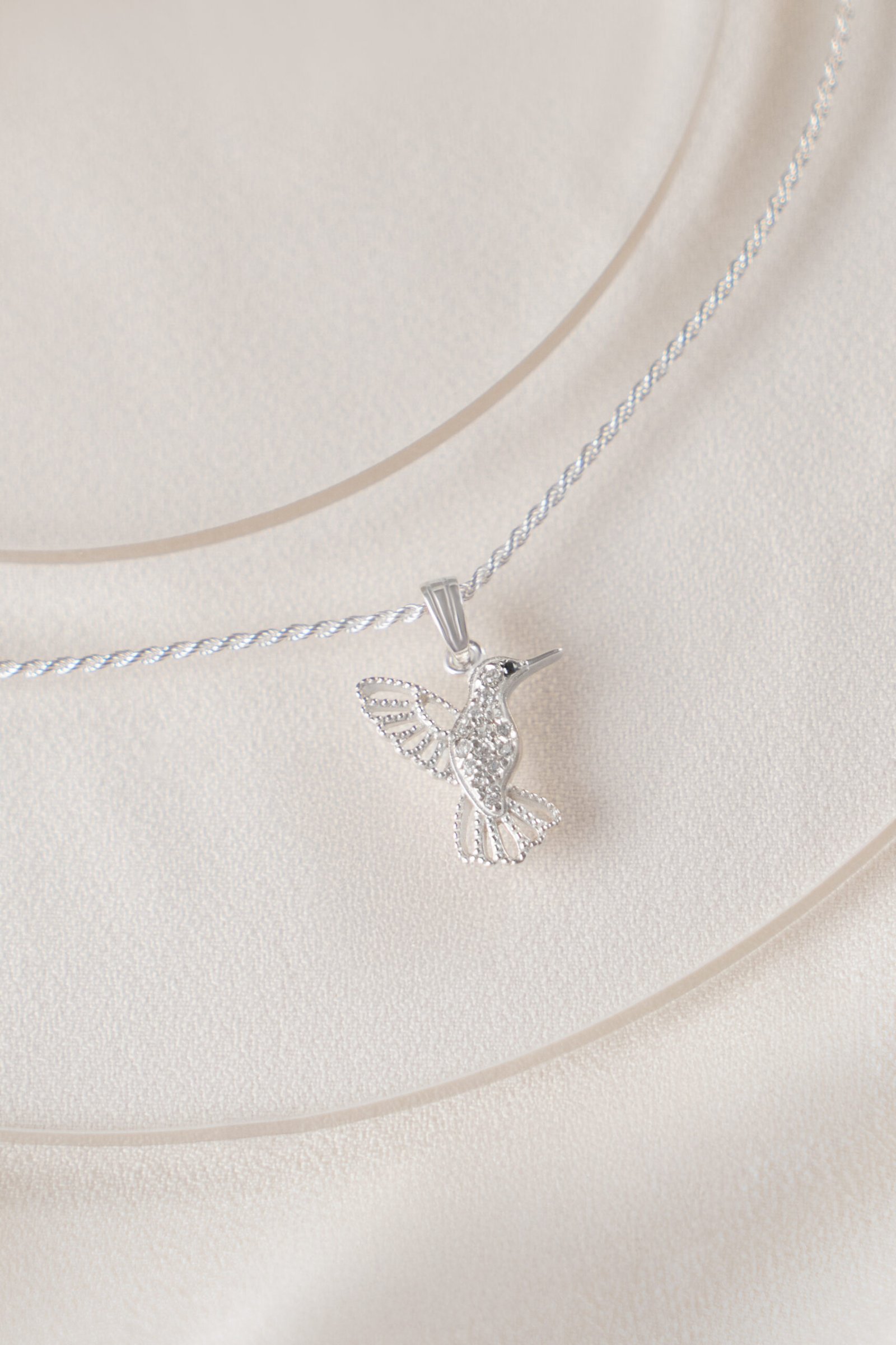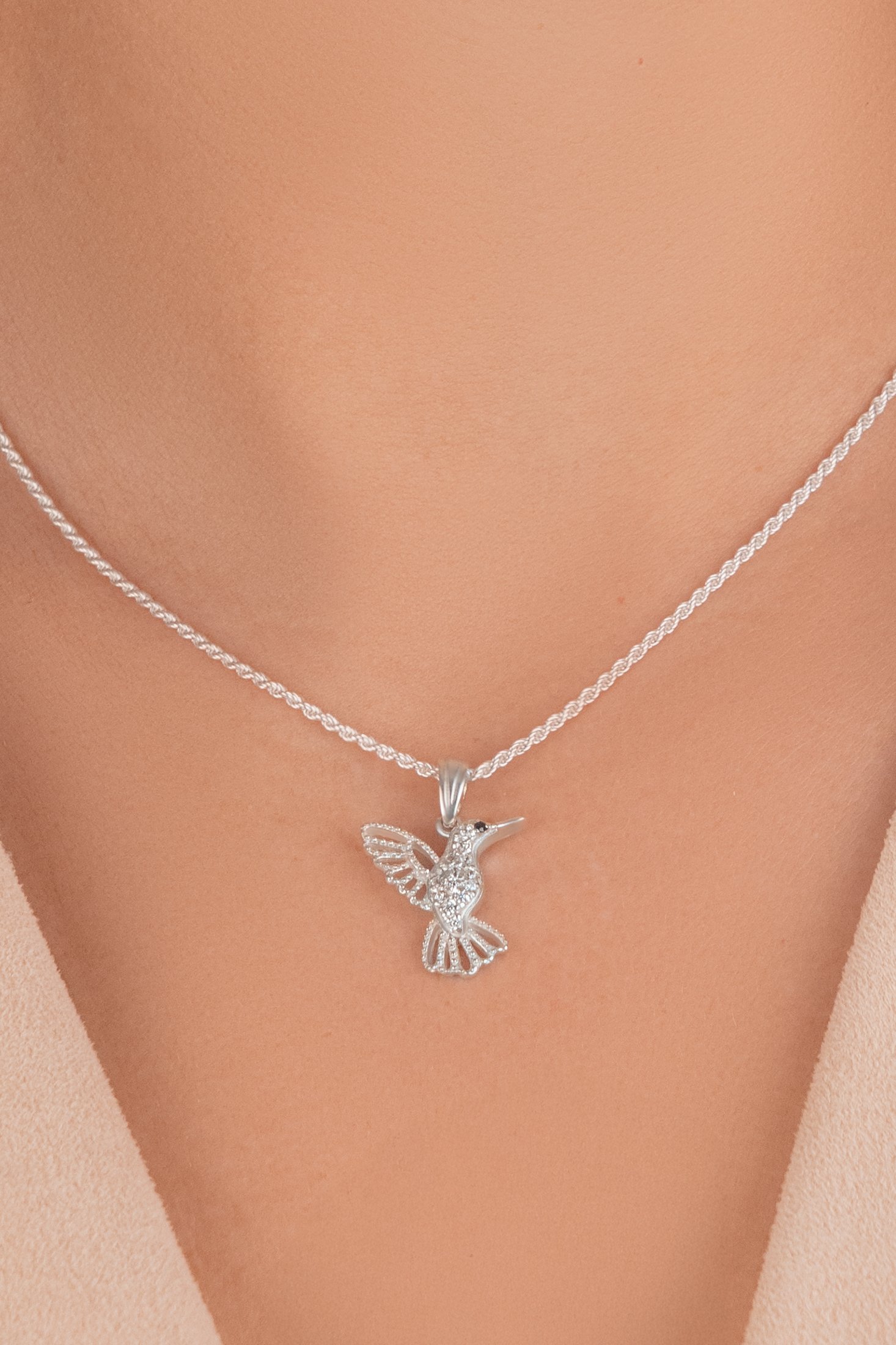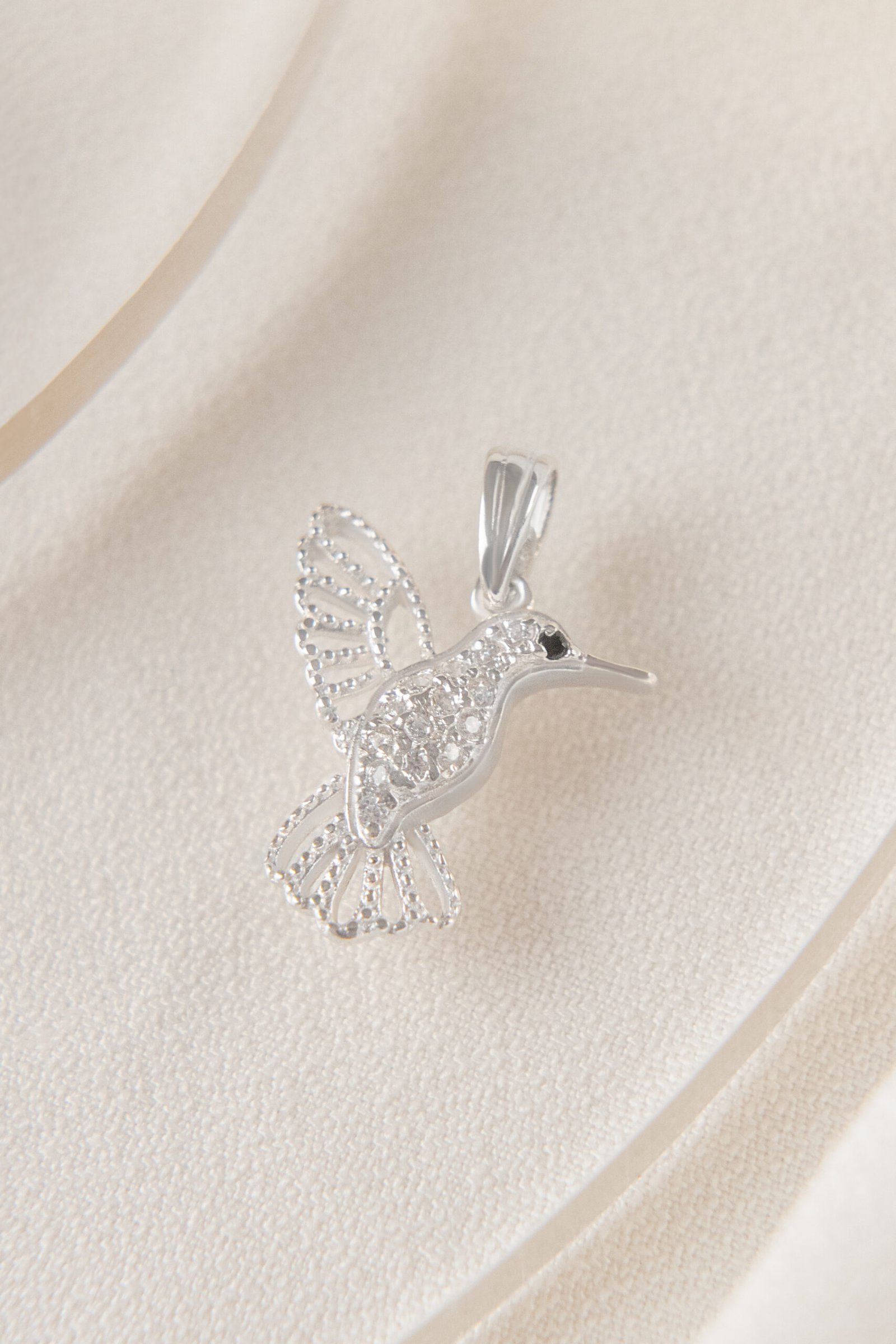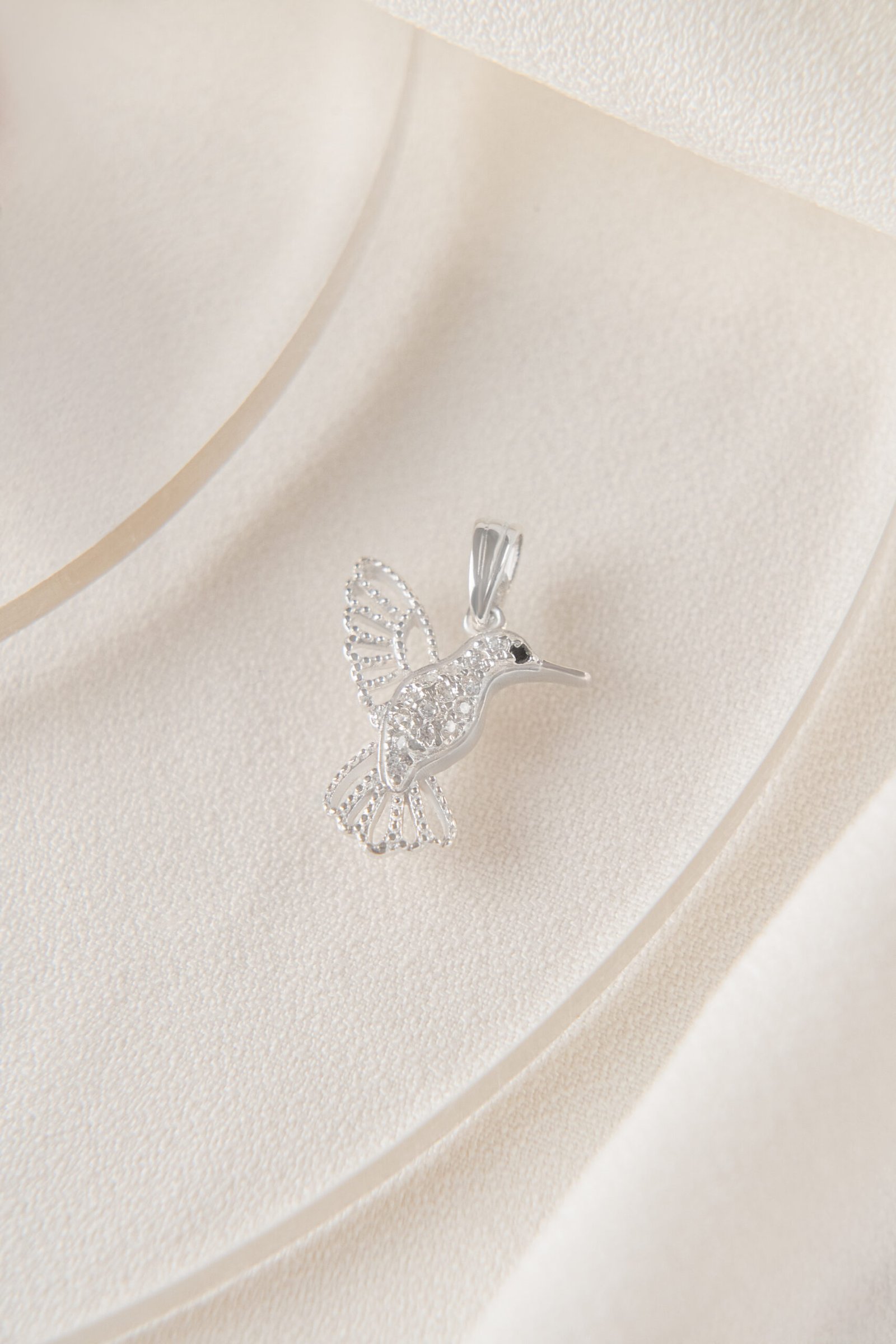 Dije Colibrí de Plata 925 con microcubics zirconias. Una joya llena de significado, que forma parte de nuestra colección de amuletos. Su delicado diseño representa al símbolo espiritual de amor y conexión eterna.
