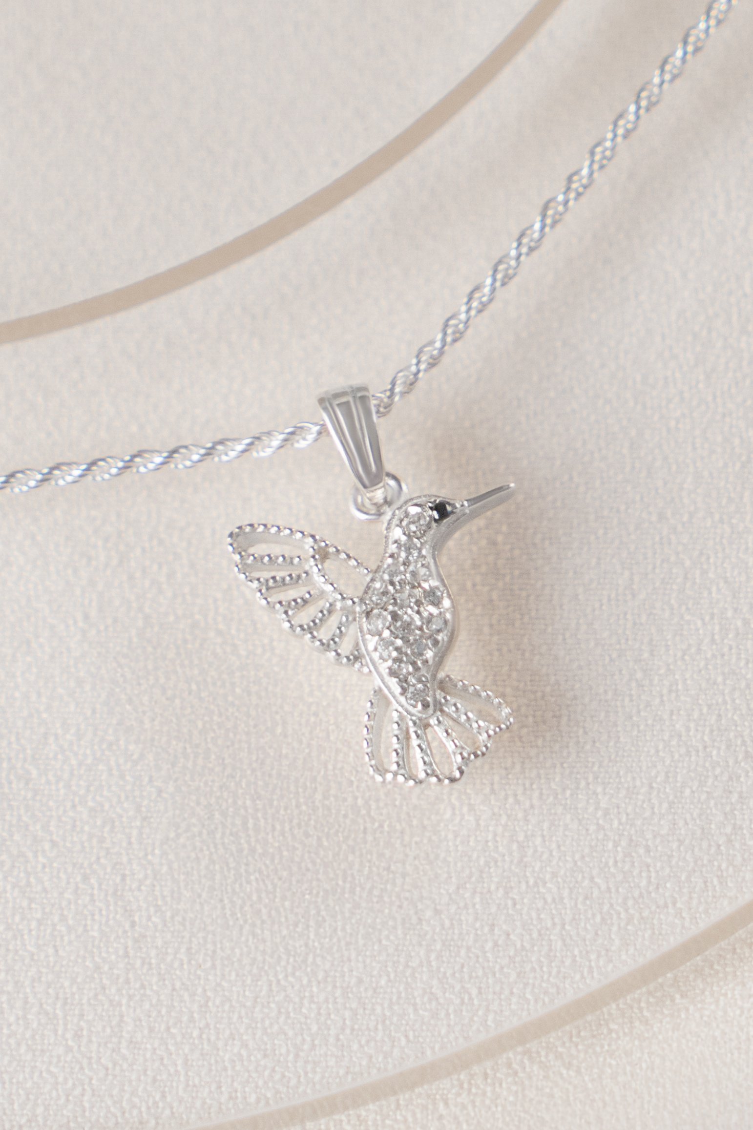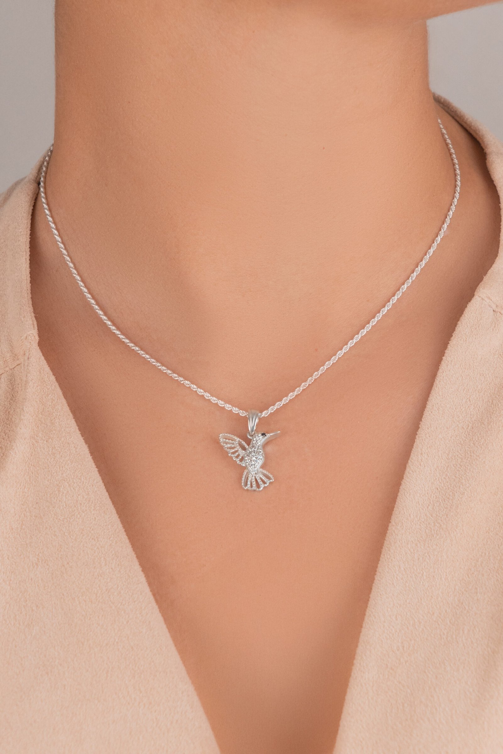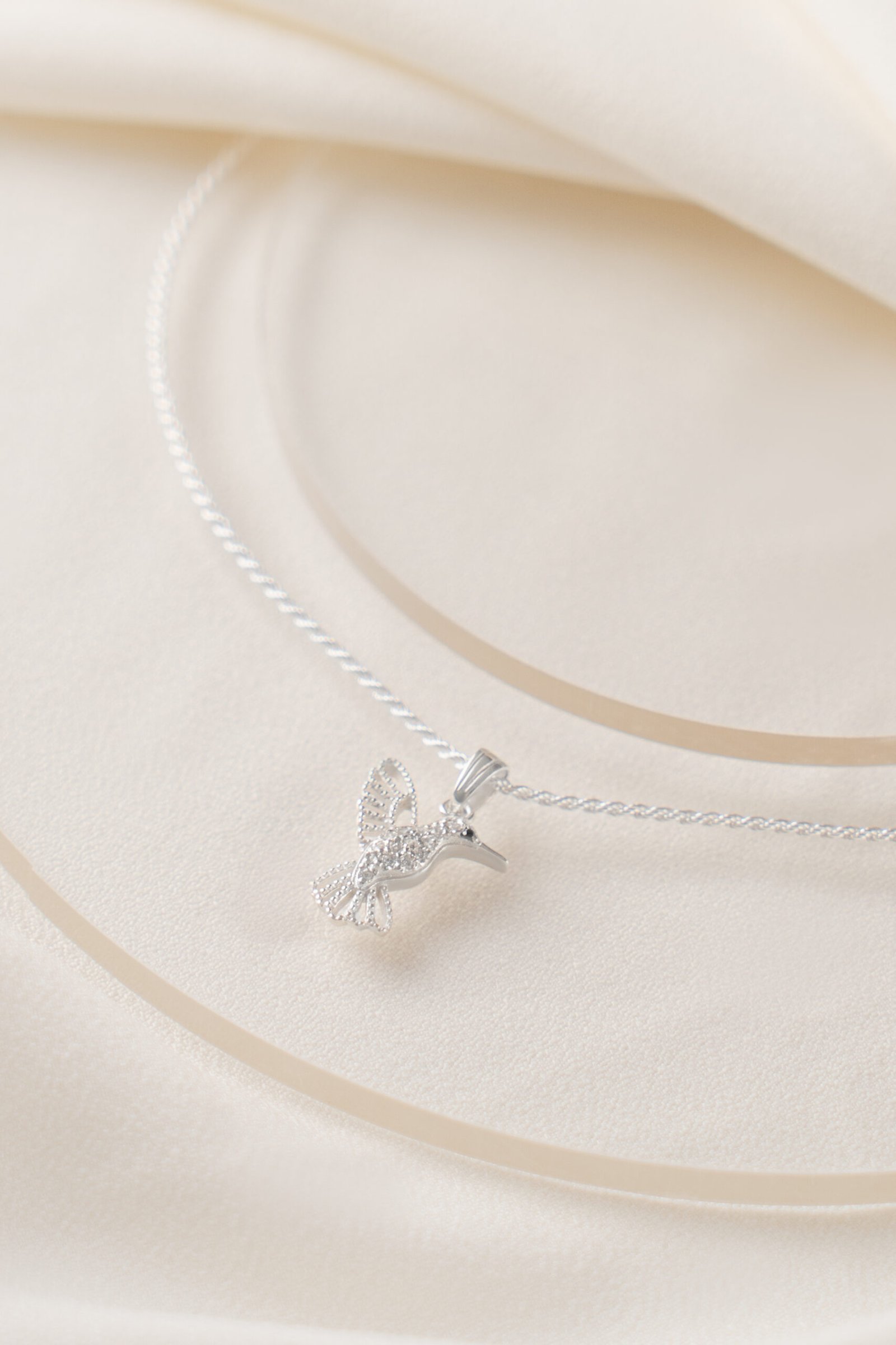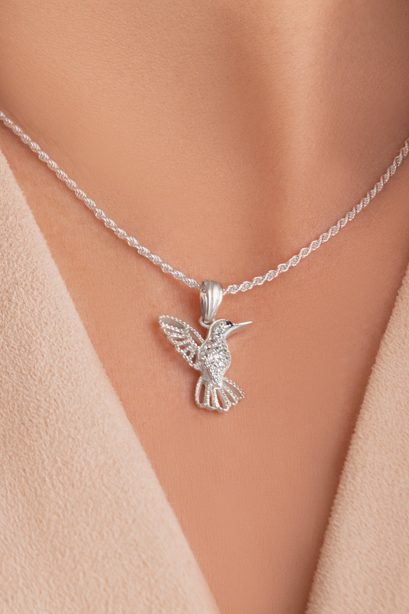 Dije Colibrí de Plata 925 con microcubics zirconias. Una joya llena de significado, que forma parte de nuestra colección de amuletos. Su delicado diseño representa al símbolo espiritual de amor y conexión eterna.