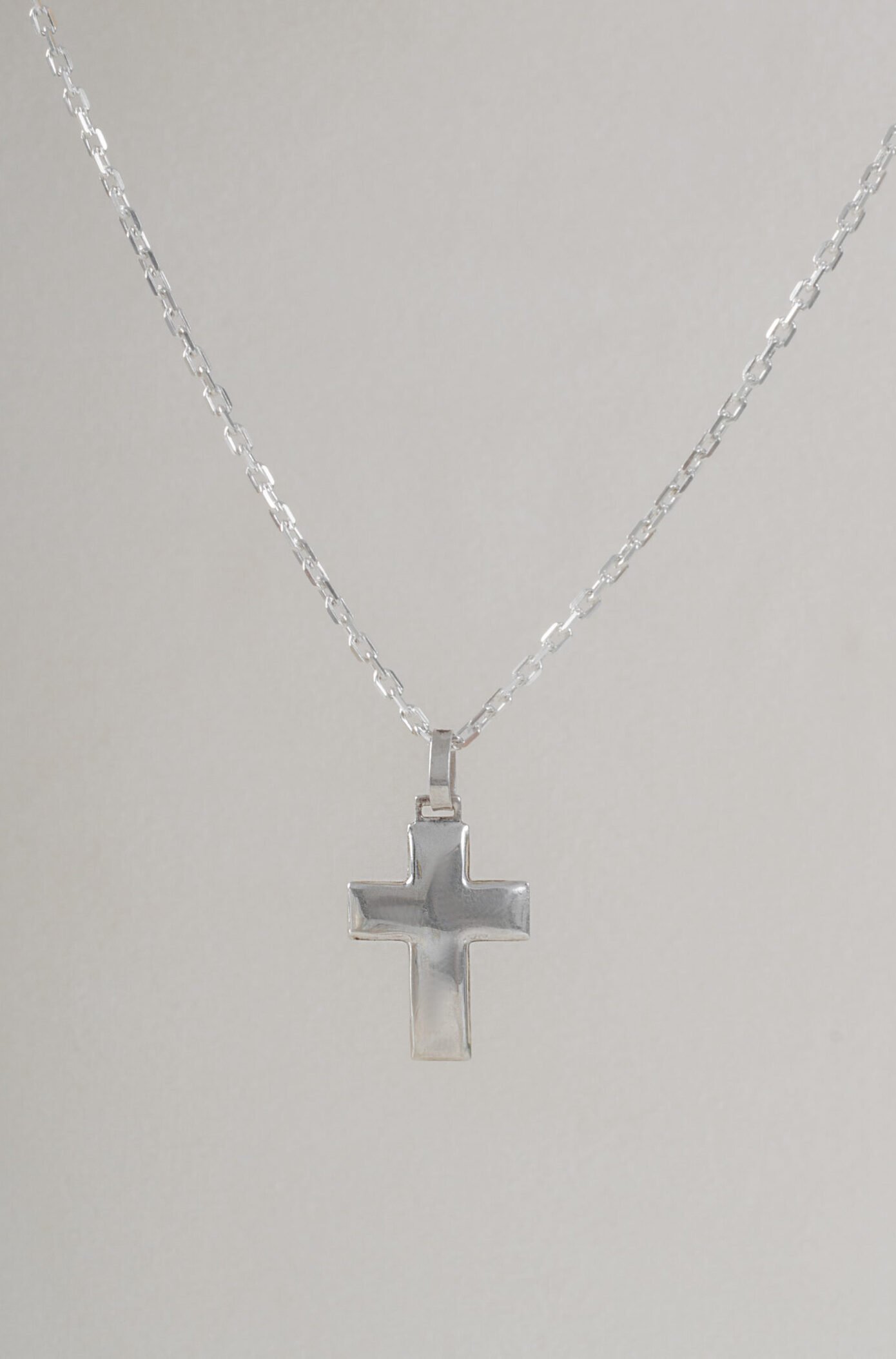 Cruz de plata 925, un diseño clásico y atemporal que nunca pasa de moda. Esta versión se distingue por su estilo bombé, que le otorga volumen y presencia, manteniendo a la vez líneas rectas que refuerzan su estética tradicional.