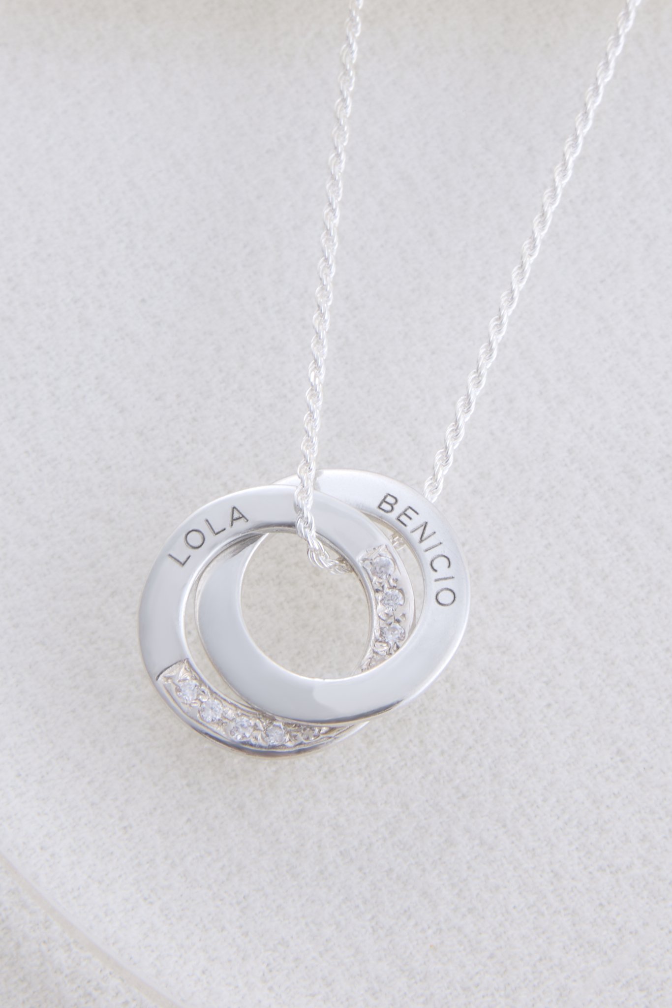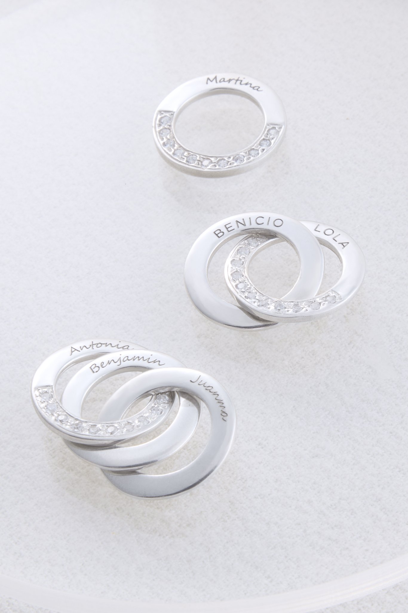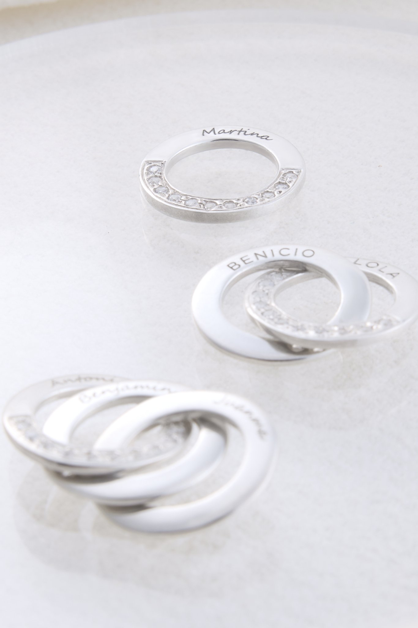 Combina una argolla con cubics engarzados y otras lisas, todas personalizables con grabados.