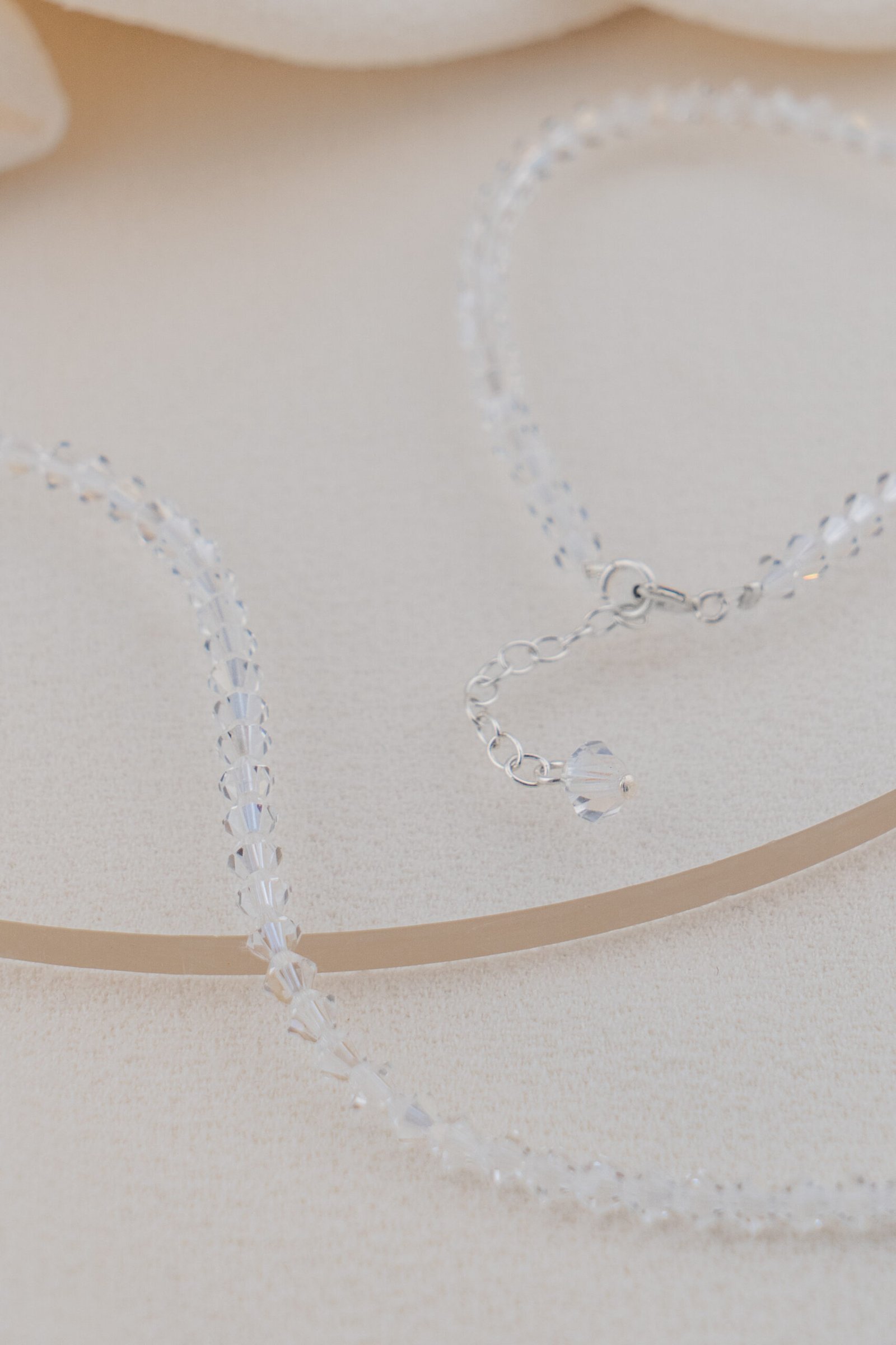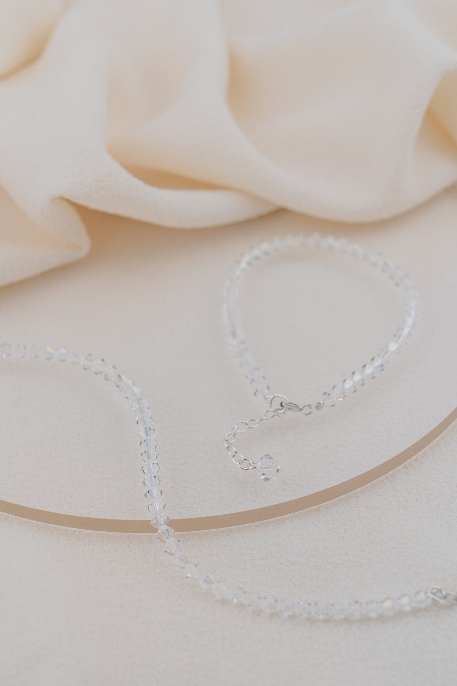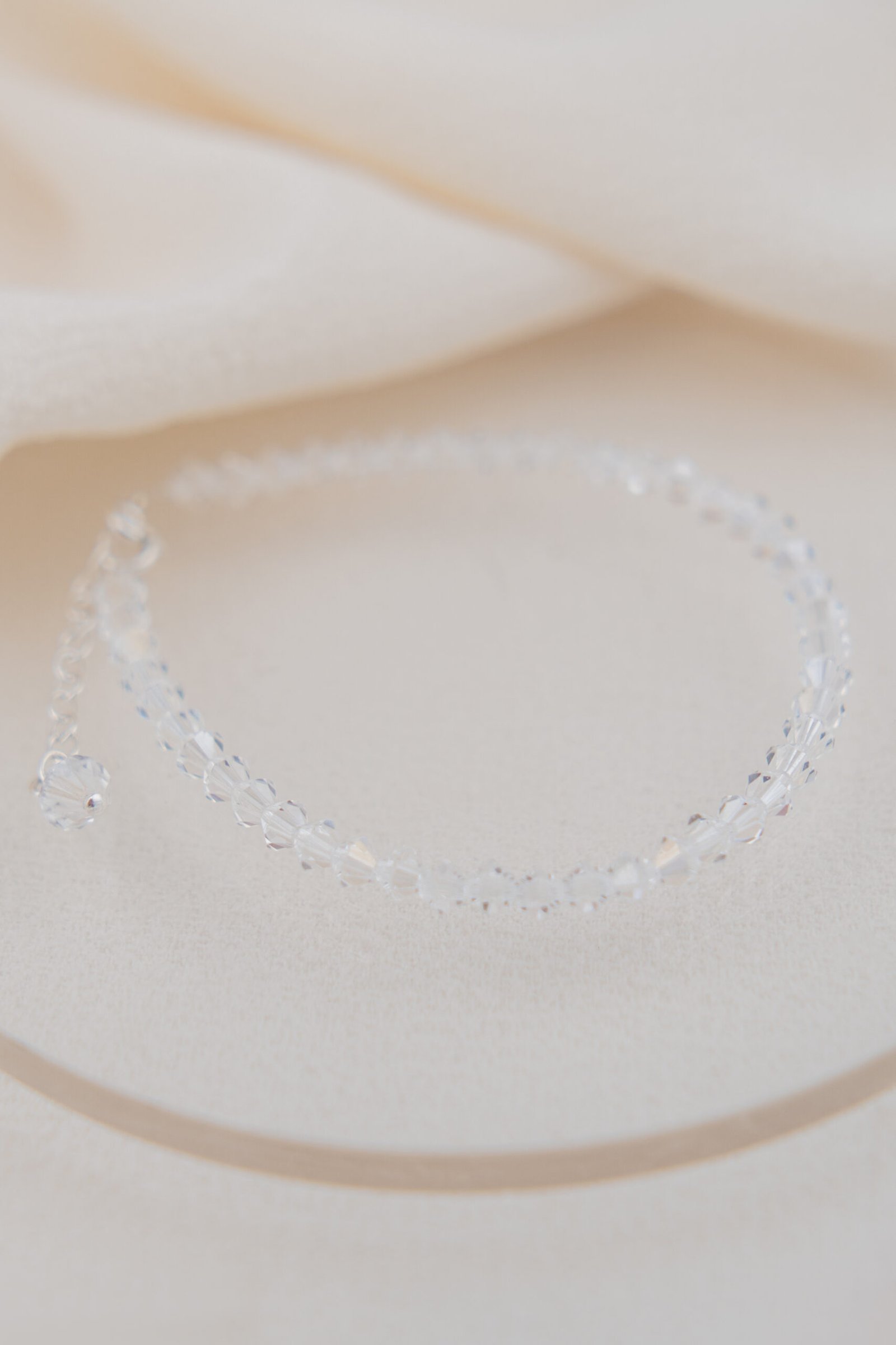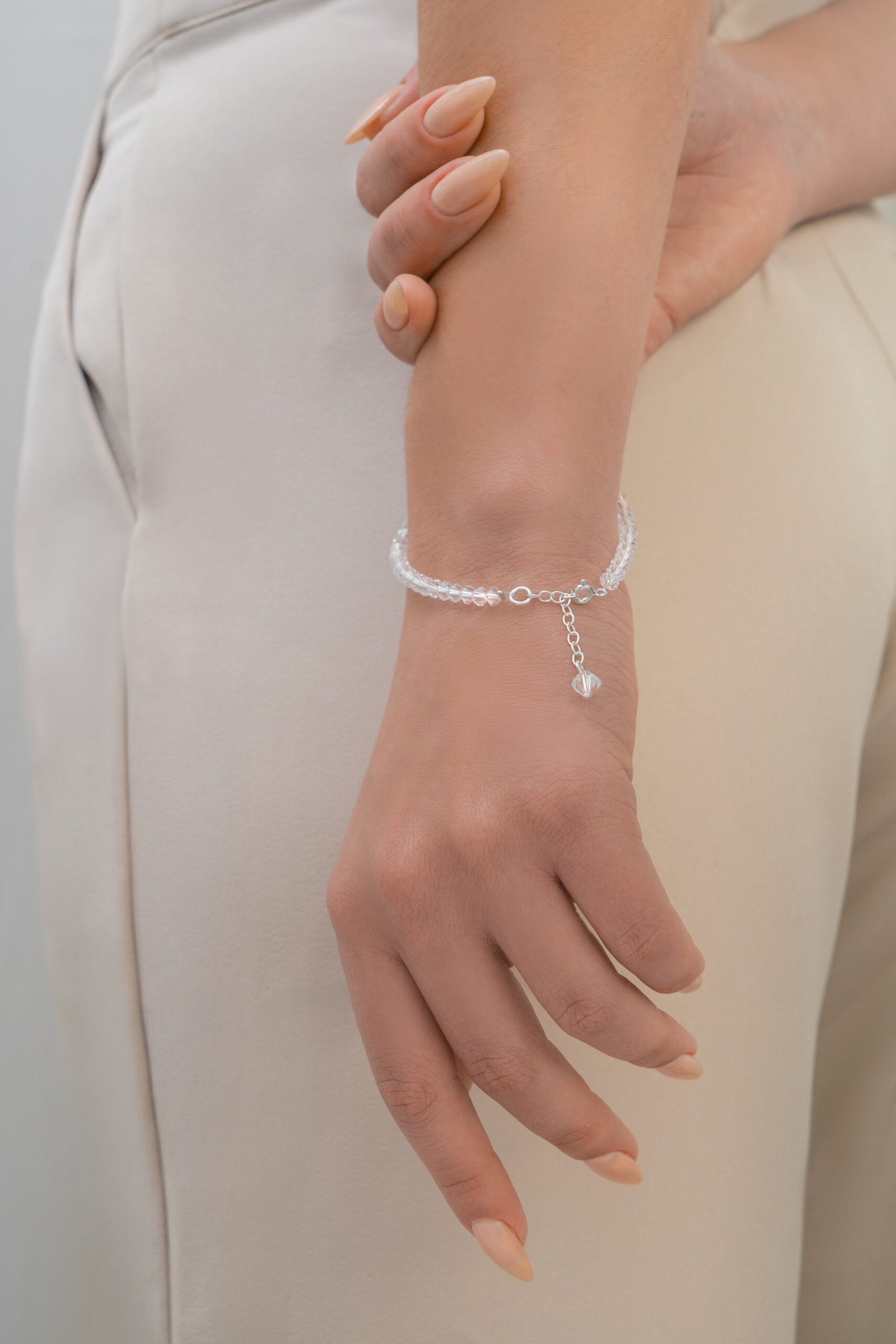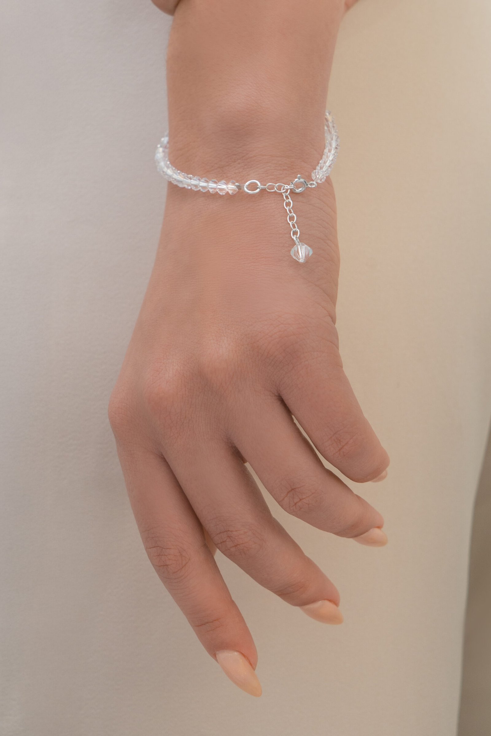 Pulsera de Plata 925 y cristales austriacos transparentes que reflejan la luz con un brillo suave y elegante. Su diseño artesanal, minimalista y luminoso la convierte en una joya perfecta para usar todos los días o en una ocasión especial.