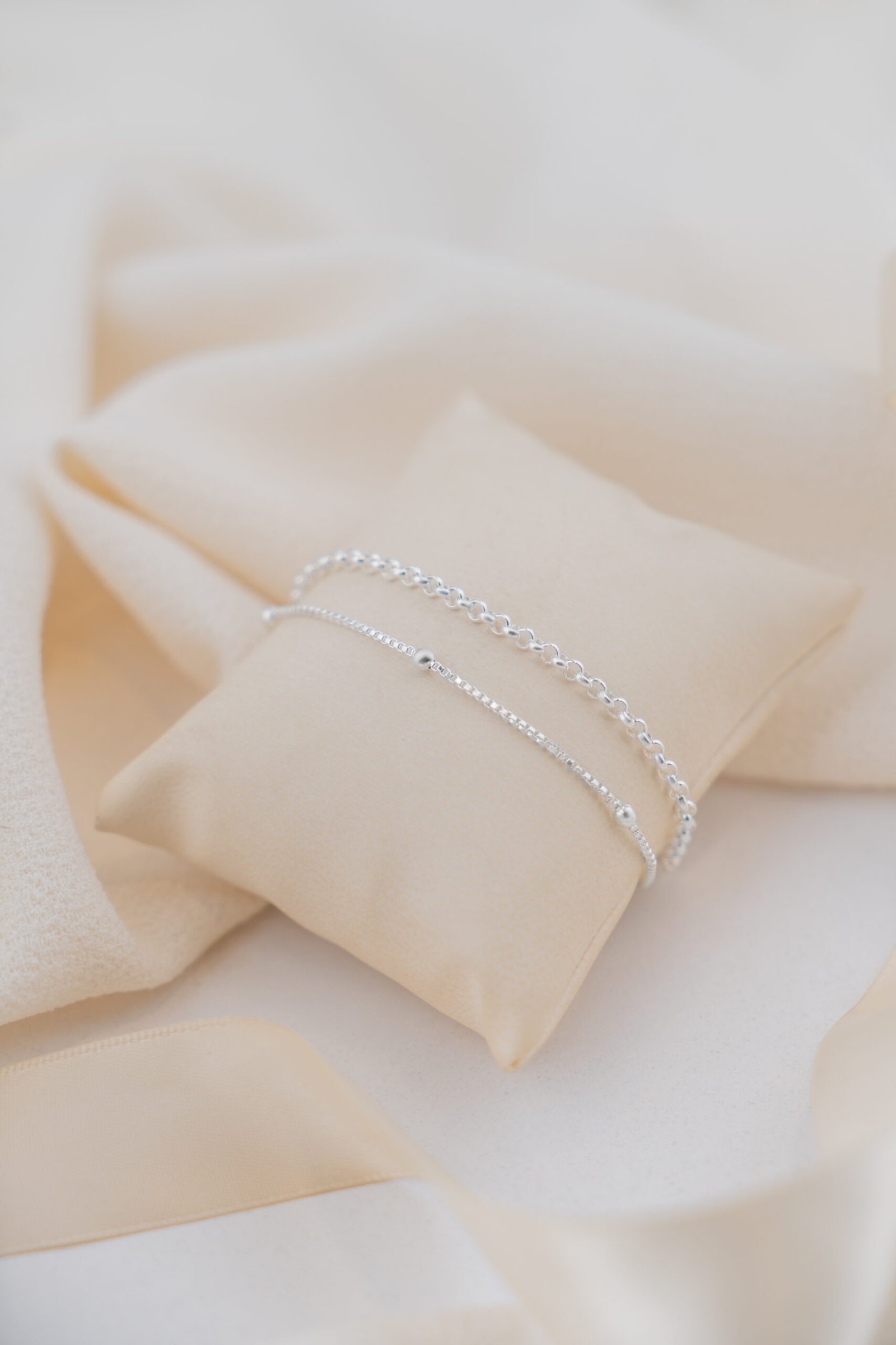 Pulsera de acero blanco doble que combina dos tramados clásicos: rolo y veneciana. Su detalle de bolitas en la cadena veneciana suma dinamismo y textura, logrando una pieza equilibrada y actual.