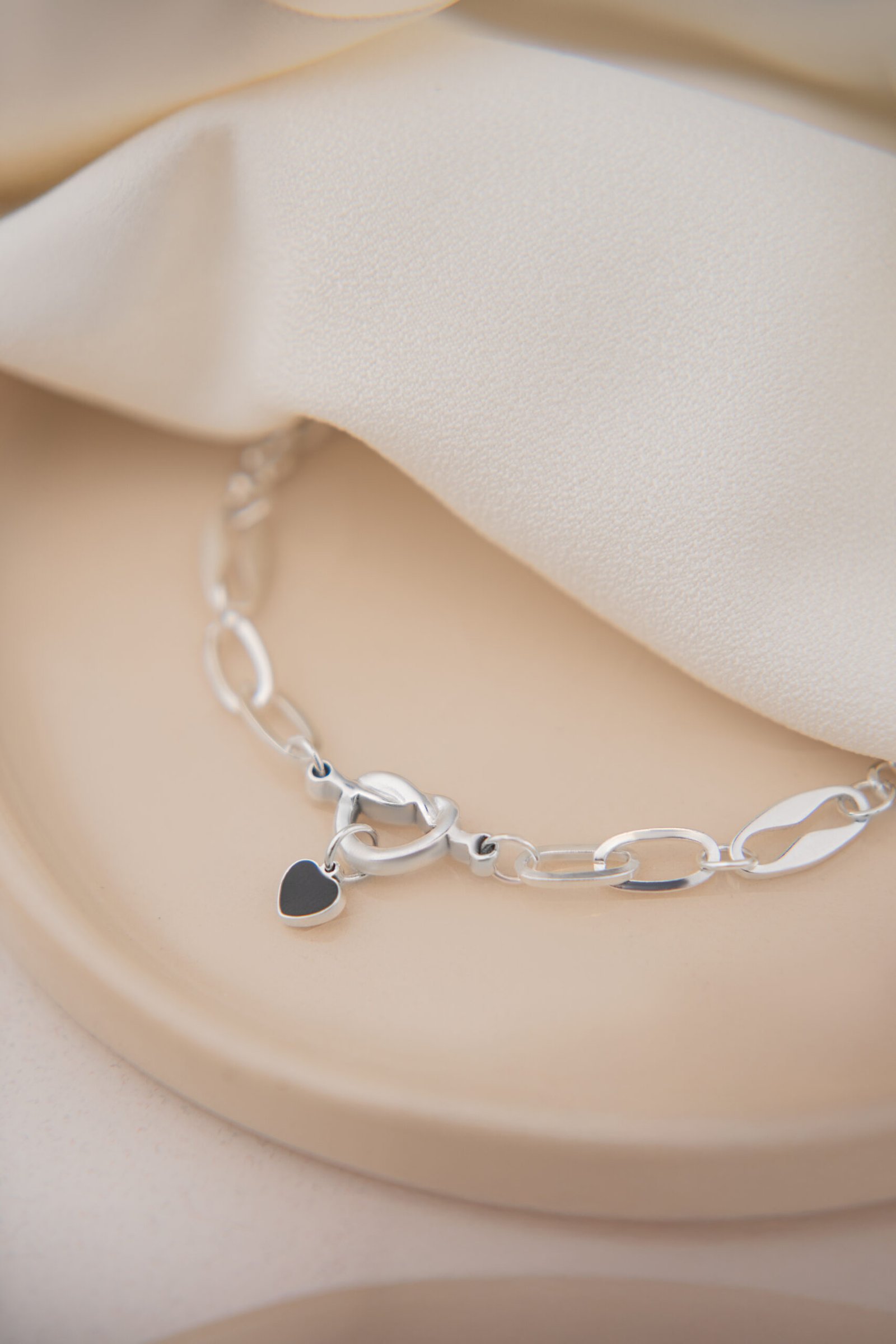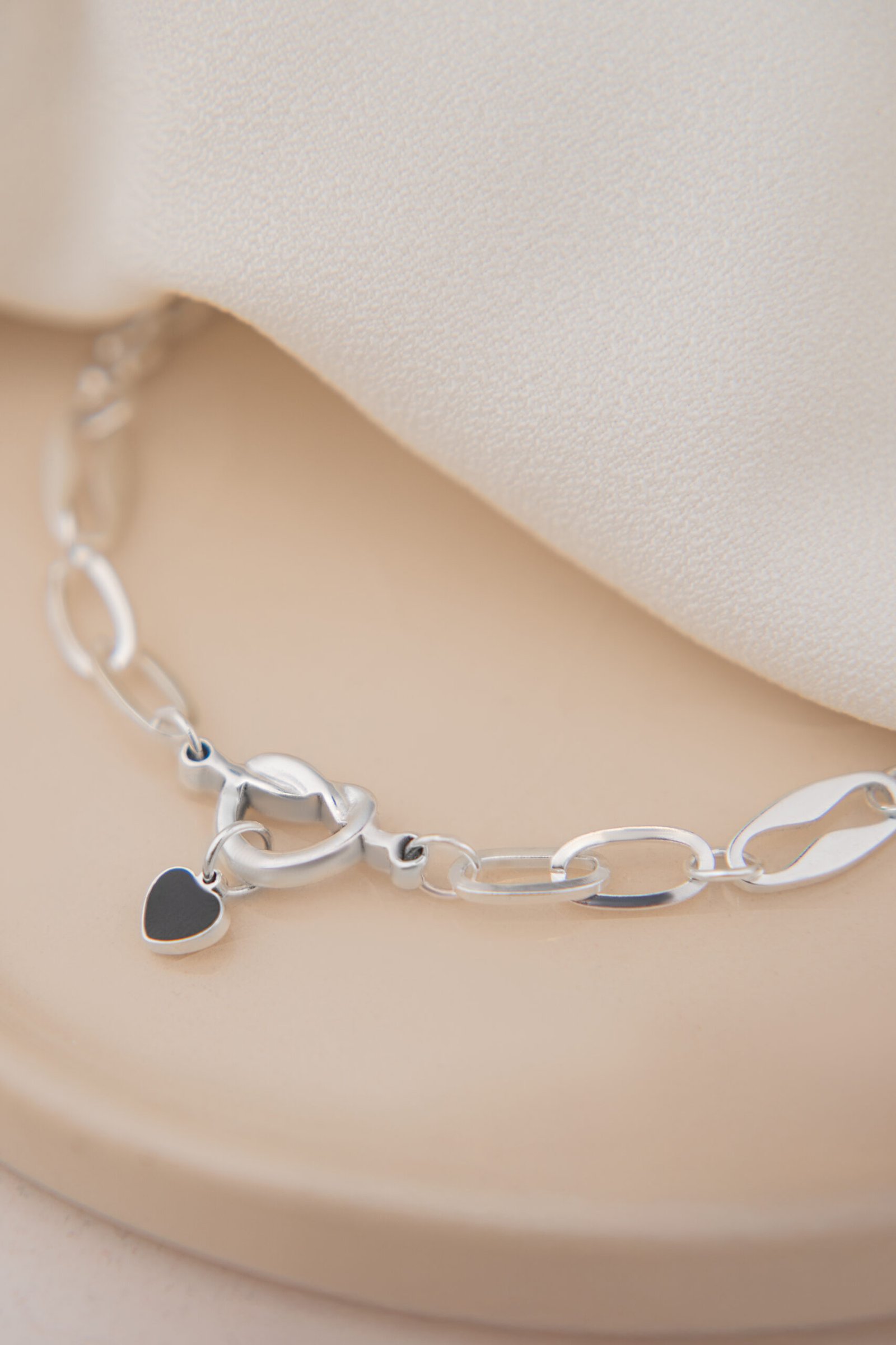 En el centro, se destaca un corazón liso que simboliza el eje del diseño, acompañado por un pequeño dije colgante en tono negro que suma contraste y carácter.