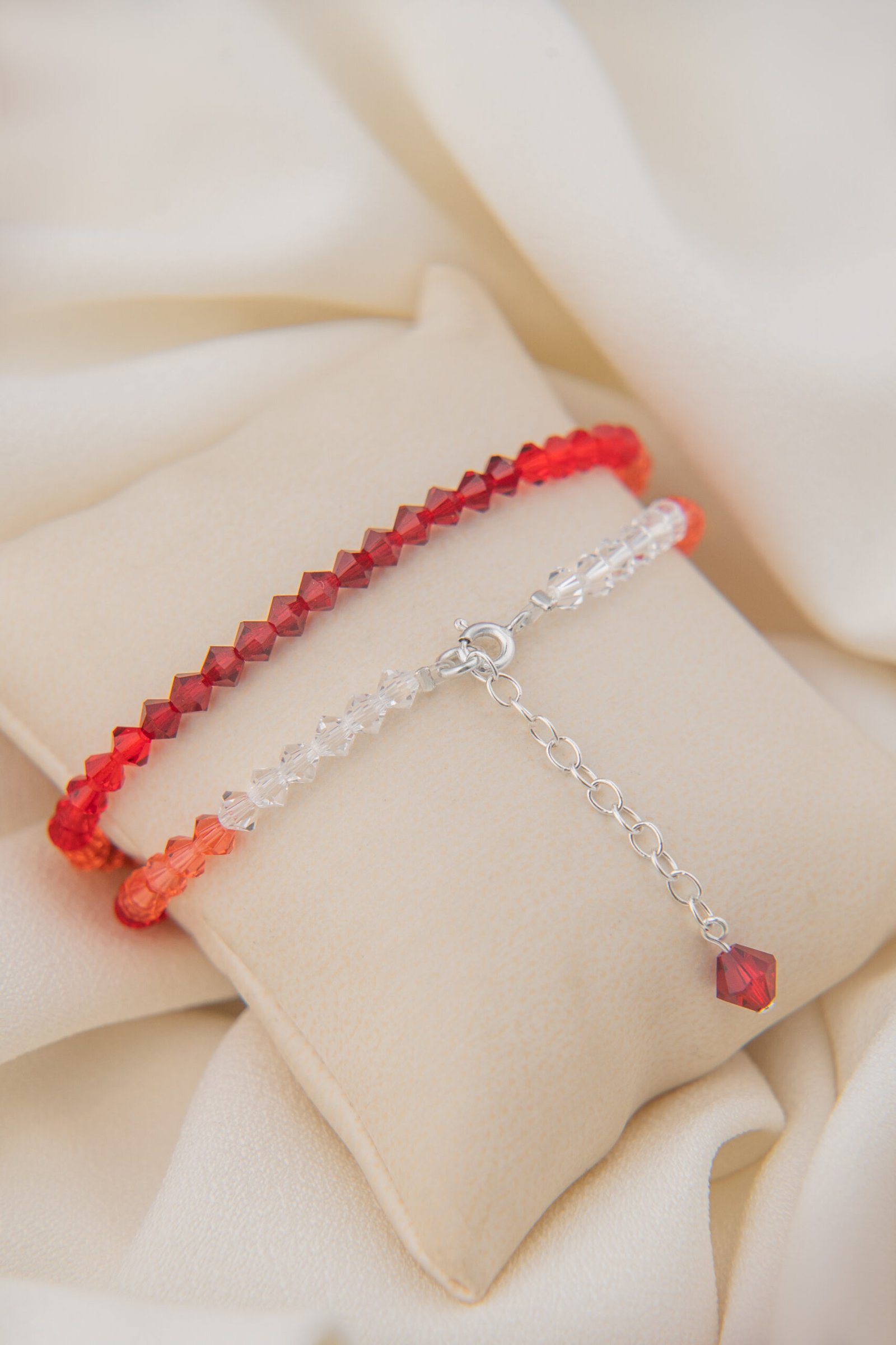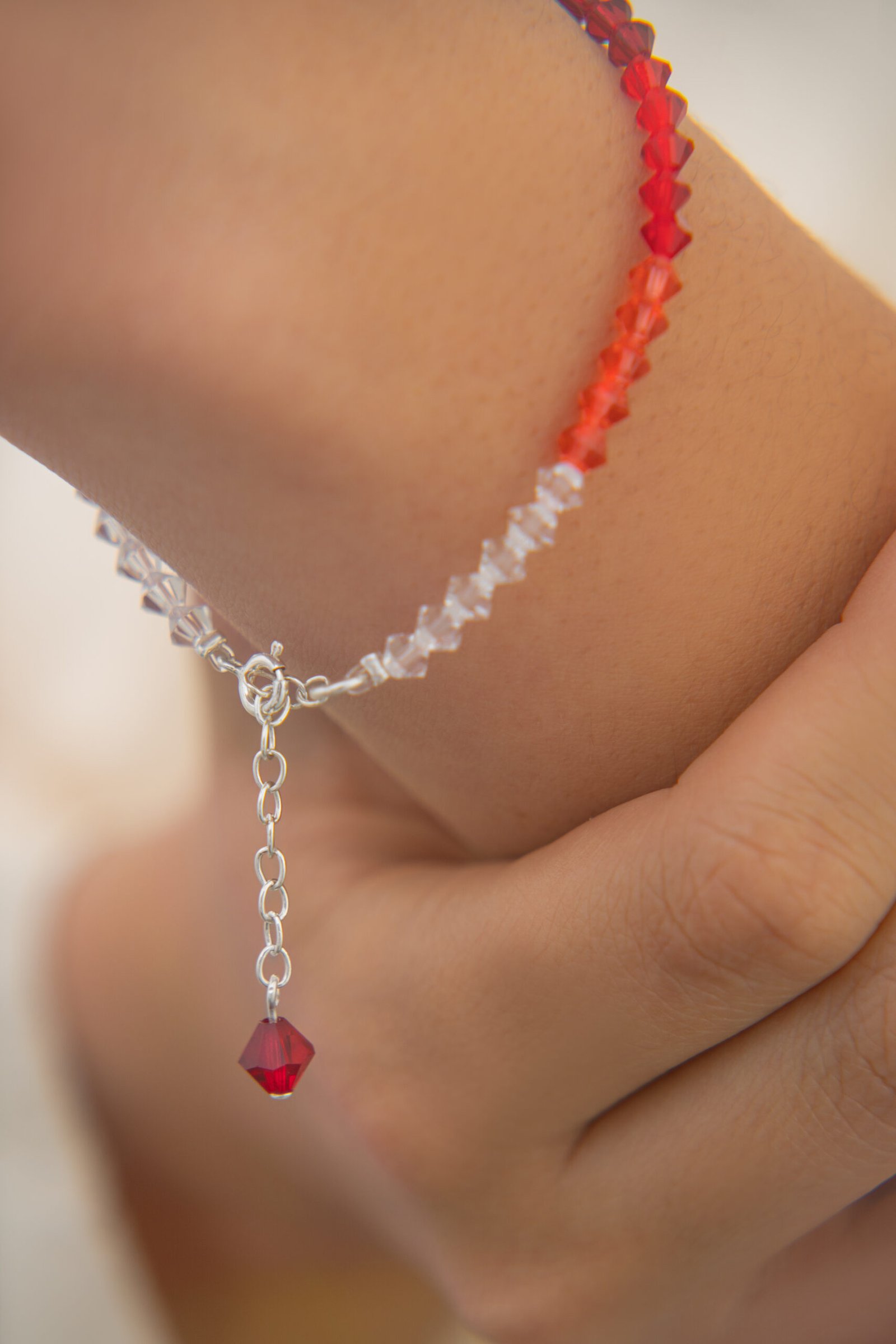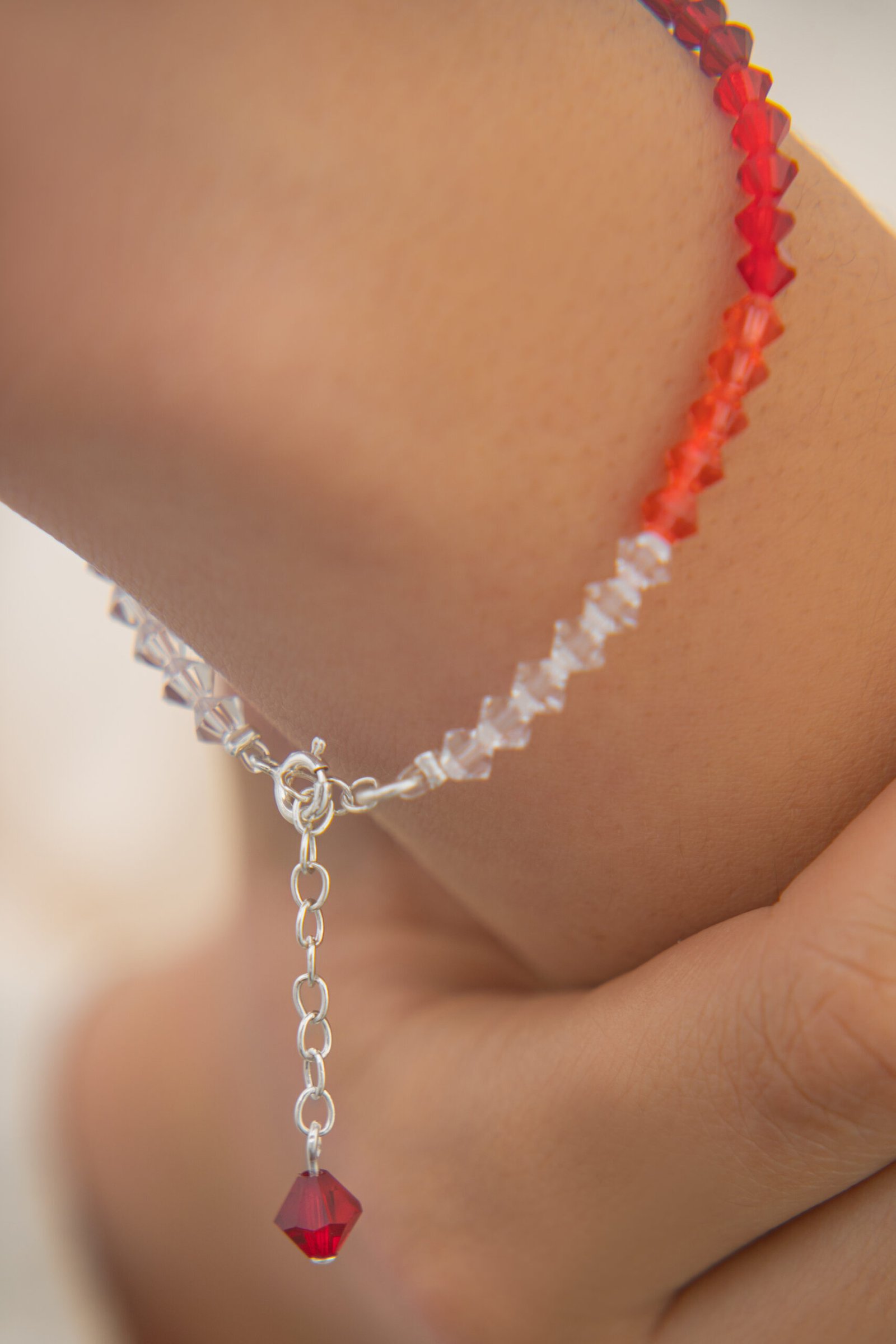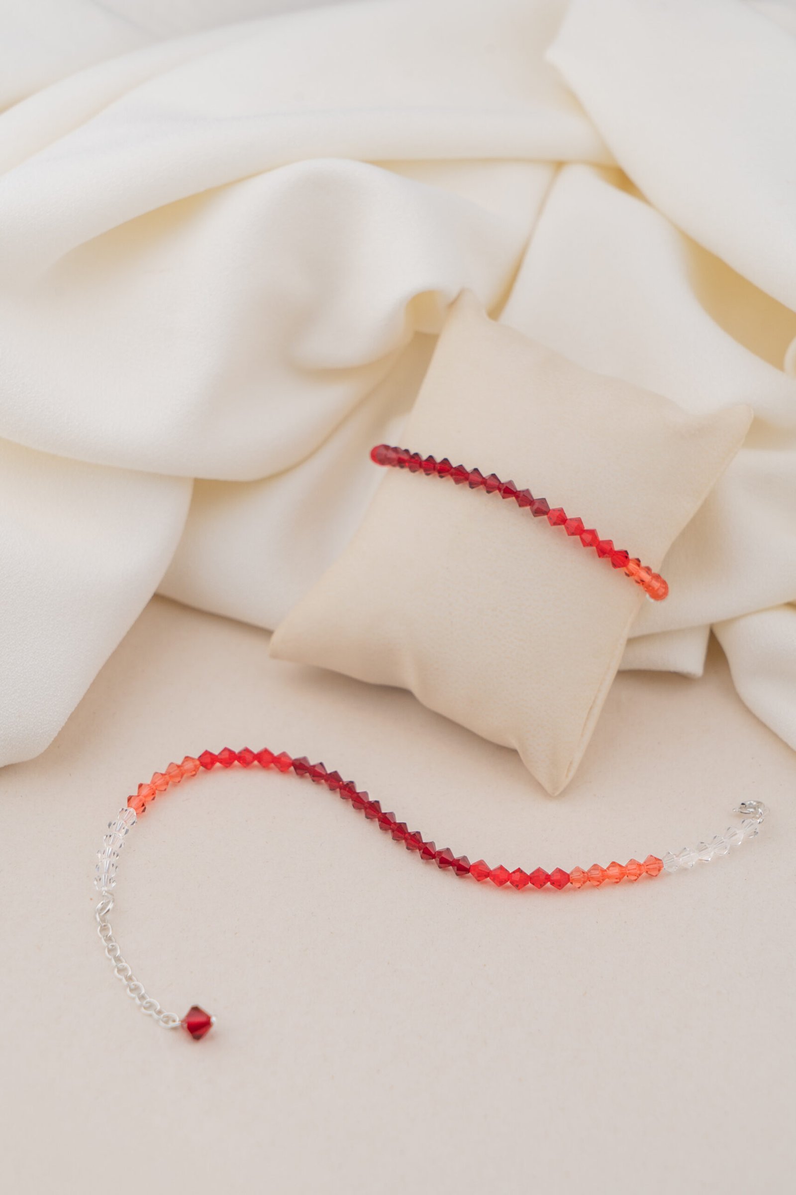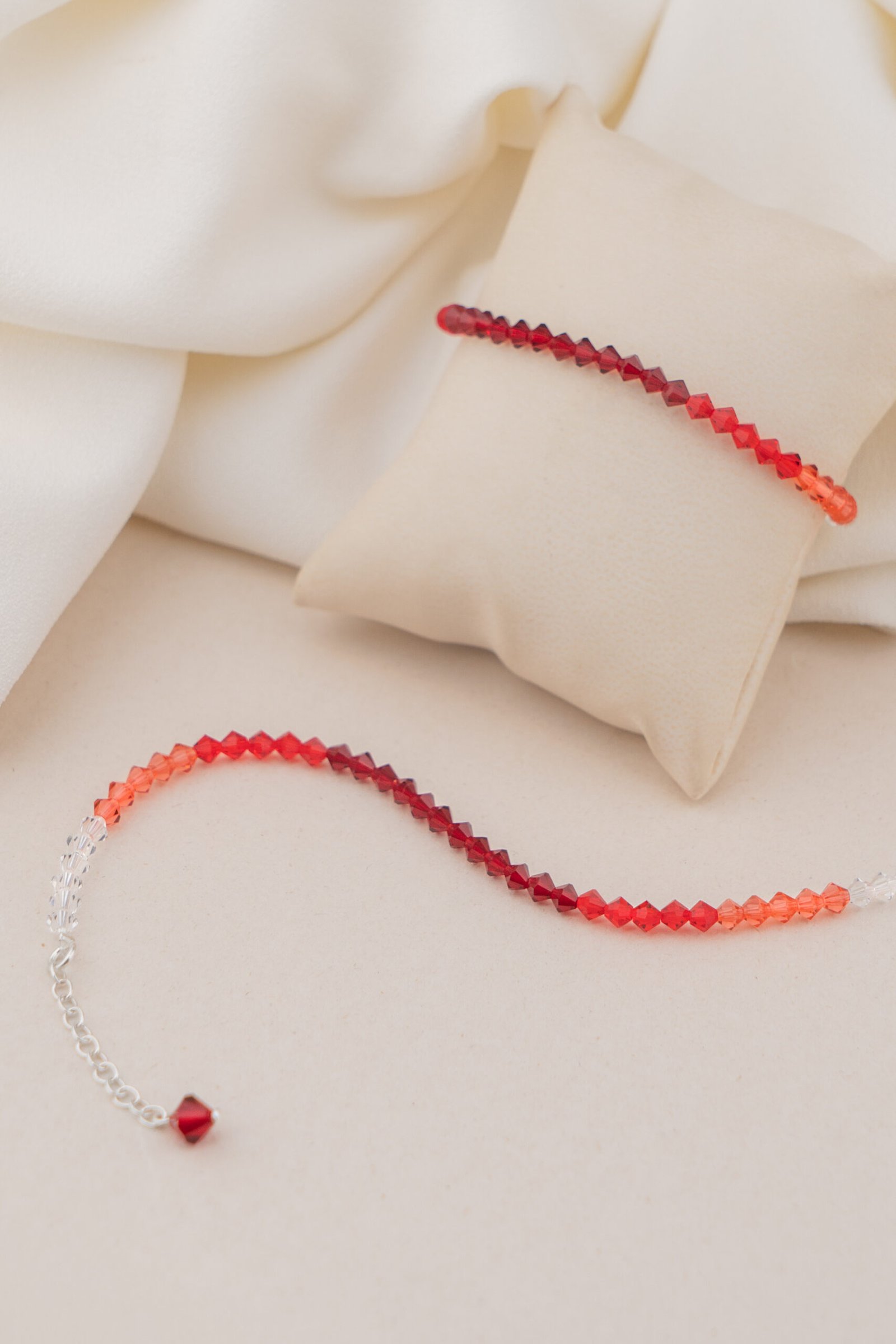 Pulsera de Plata 925 y cristales austriacos en tonalidades rojas en degradé. Cada cristal refleja la luz con un brillo cálido e intenso, aportando una dosis justa de color y estilo a tu muñeca, creando un efecto visual encantador y lleno de energía.